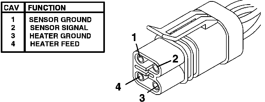 2. Set DVOM to read OHMS. Connect the ohmmeter between the heater feed and heater ground (terminals 3 and 4), of the sensor electrical connector.