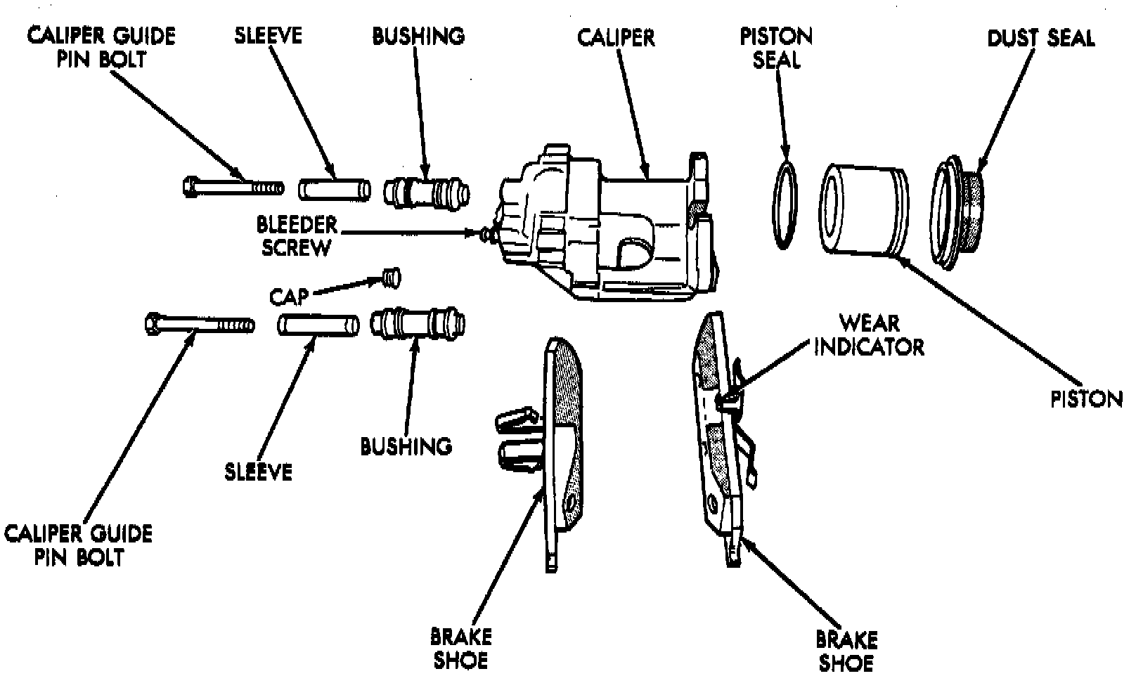 The single piston, floating caliper disc brake assembly, consists of the rotor, caliper, pads and the driving hub. The caliper is mounted through bushings and sleeves by two through-bolts threaded into an adapter. Two machined abutments on the adapter position and align the caliper fore and aft. The mounting bolts and bushings control the movement of the caliper and the piston seal to assist in maintaining proper pad clearance.