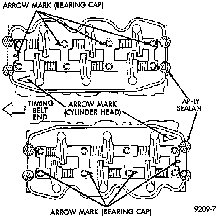 1. Apply Mopar Silicone Rubber Adhesive Sealant at bearing cap ends as shown in Fig. 8.