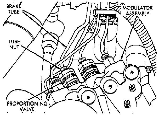 4. Remove battery acid shield from modulator assembly, then remove brake tube from proportioning valve.