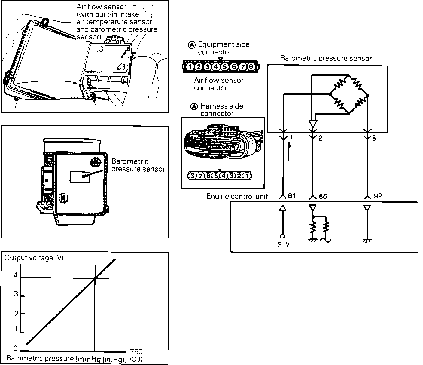 The ECM uses the voltage signal to adjust the air-fuel ratio and ignition timing for the altitude at which the vehicle is running, thus improving driveability at high altitude.