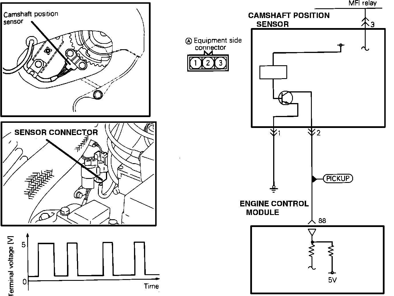 Power is supplied to the camshaft position sensor from the MFI relay and is grounded to the body.