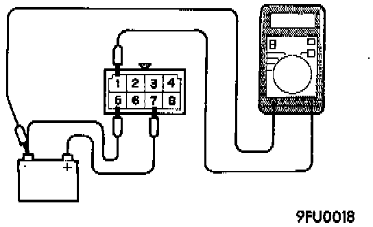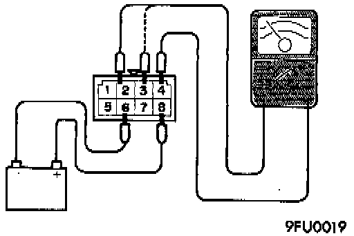6. Connecting and disconnecting the jumper wire to battery - terminal, check the continuity across terminals 2 and 4 (or 3 and 4) of the MFI relay.