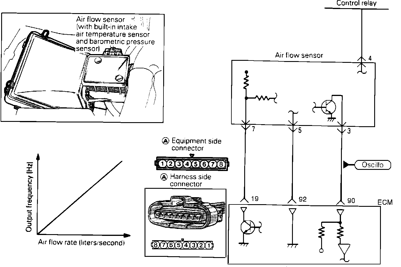This change is detected by the receiver and converted into a square wave signal, which is sent to the ECM in the form of the intake air volume signal. The ECM uses this intake air volume signal, in addition to several other signals, to decide the basic fuel injection duration.