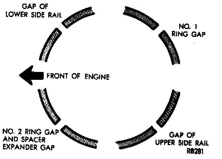 1. Before installing pistons, and connecting rod assemblies into the bore, be sure that compression ring gaps are staggered so that neither is in line with oil ring rail gap.