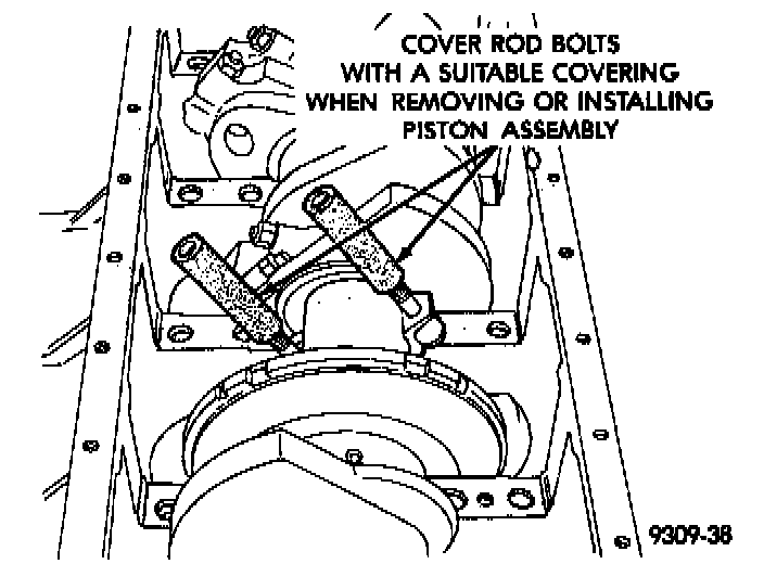 4. Remove connecting rod cap. Install connecting rod bolt protectors on connecting rod bolts. Push each piston and rod assembly out the bottom of cylinder liner.