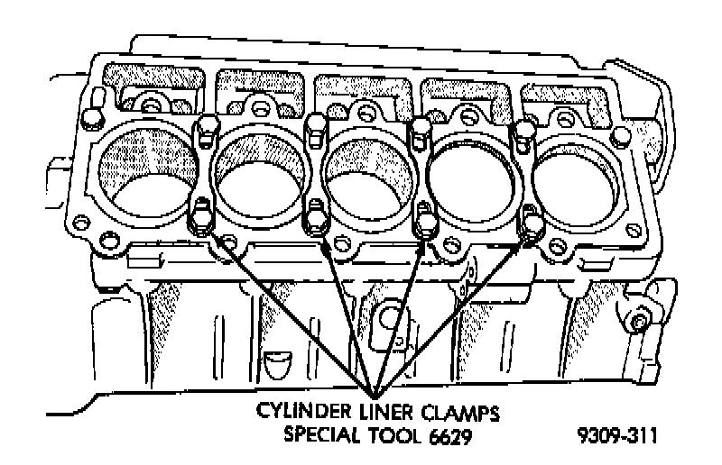 2. Install liner clamps Special Tool 6629 on the cylinders not being removed . This will prevent the liners from moving in their bores when rotating the crankshaft.