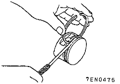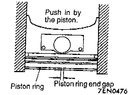 Insert a piston ring into the cylinder bore. Force it down with a piston, its crown being in contact with the ring, to correctly position it at right angle to the cylinder wall. Then, measure the end gap with a feeler gauge. If the end gap is excessive, replace the piston ring.
