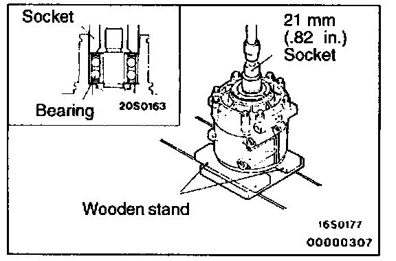 Use a wooden stand and a 21 mm (0.82 in.) socket to insert the bearing into the compressor.