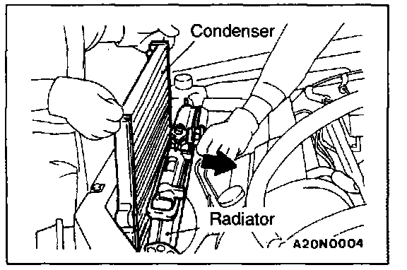 Move the radiator to the engine side and then lift up the condenser to remove it.