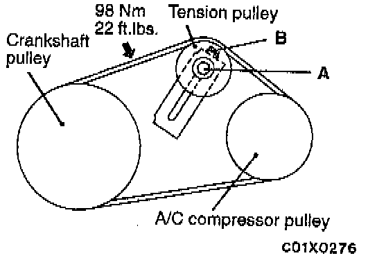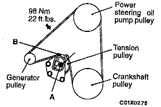Use a belt tension gauge to check belt tension at the shown point, or check deflection by applying 98 N (22 Lbs.) to the shown point. Tension should be 440 - 540 N (99 - 121 lbs.) for a used belt and 642 - 838 N (143 - 187 lbs.) for a new belt. Deflection should be 11.5 - 12.5 mm (0.45 - 0.49 inch) for a used belt and 9.0 - 10.5 mm (0.35 - 0.41 inch) for a new belt.