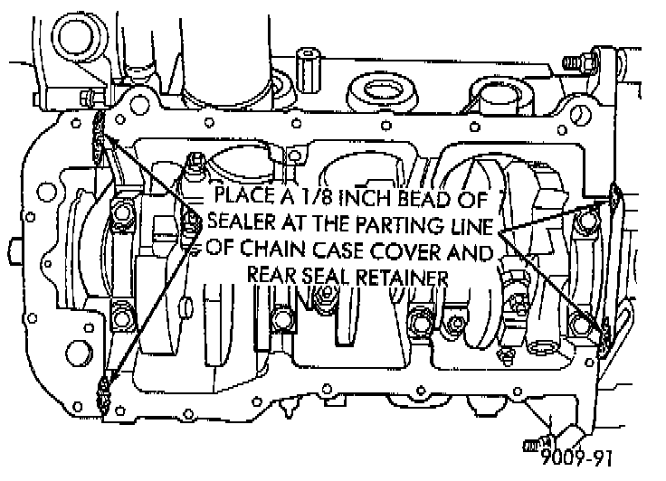 2. Apply a 1/8 inch bead of Mopar (R) Silicone Rubber Adhesive Sealant or equivalent, at the parting line of the chain case cover and the rear seal retainer.