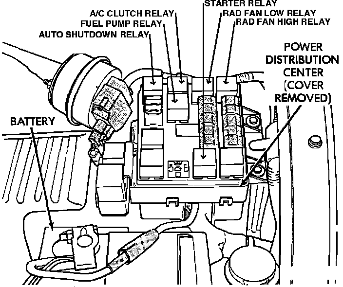 The Auto Shutdown (ASD) relay is located inside the power distribution center. The power distribution center is located next to the battery.