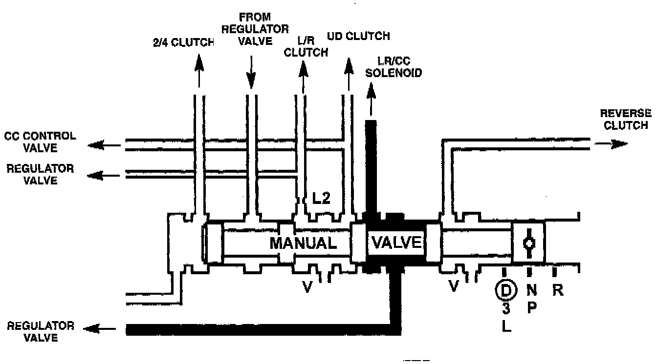 The manual valve operates by mechanical shift linkage only. Its job is to send line pressure to the appropriate hydraulic circuits and solenoids. The valve has three operating ranges or positions. The valve shifts to the left position when OD, Drive or Low is selected. The valve shifts to the middle position in both Park and Neutral. The valve moves to the right position when Reverse is selected.
