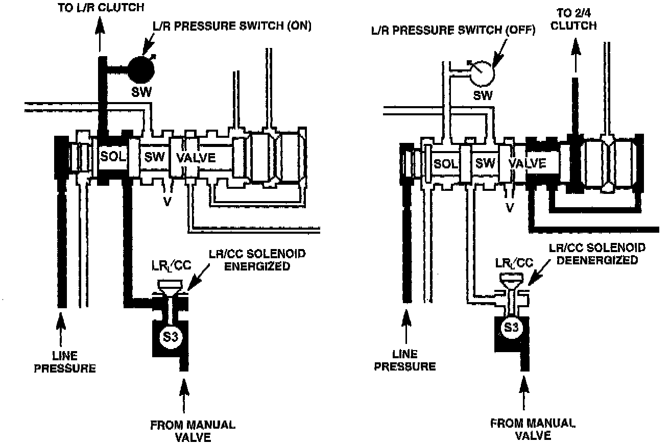 The switch valve controls the direction of line pressure from the LR/CC solenoid. When the valve is shifted to the right, it allows the low/reverse clutch to be pressurized. When it is shifted to the left, it directs line pressure to the TO and CC control valves to operate the TO clutch. The valve is shifted to the right in all gears except 2nd, 3rd and 4th gear. When the transaxle upshifts to 2nd gear, the valve moves to the left, which allows converter clutch engagement when needed. The valve must return to the right before a downshift to 1st gear can occur.