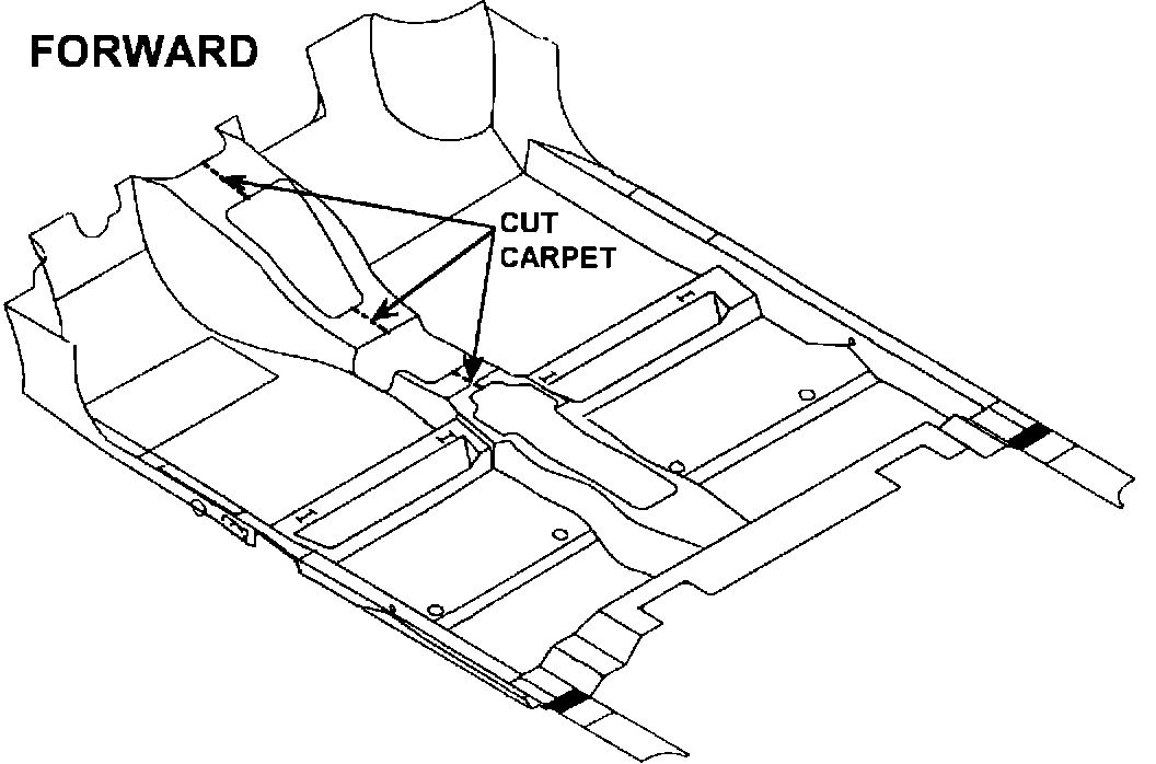 2. Cut the carpet in three places - under the instrument panel in the middle of the tunnel formation, under the shifter and under the shifter cables (See Illustration).