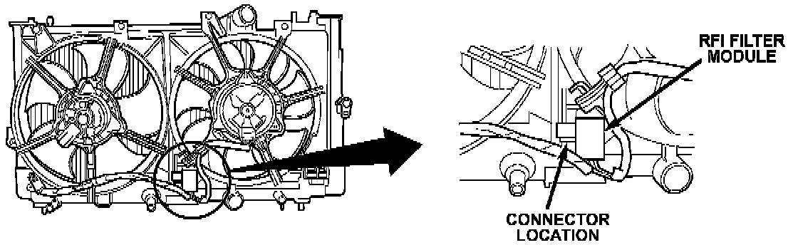 Visually inspect the RFI connector and RFI filter module for signs of damage. If damage is found proceed to repair procedure. If no damage is found, proceed to cooling system diagnosis in the 1997 Neon Service Manual (Publication Number 81-270-7025) beginning on page 7-8. (See Illustration)