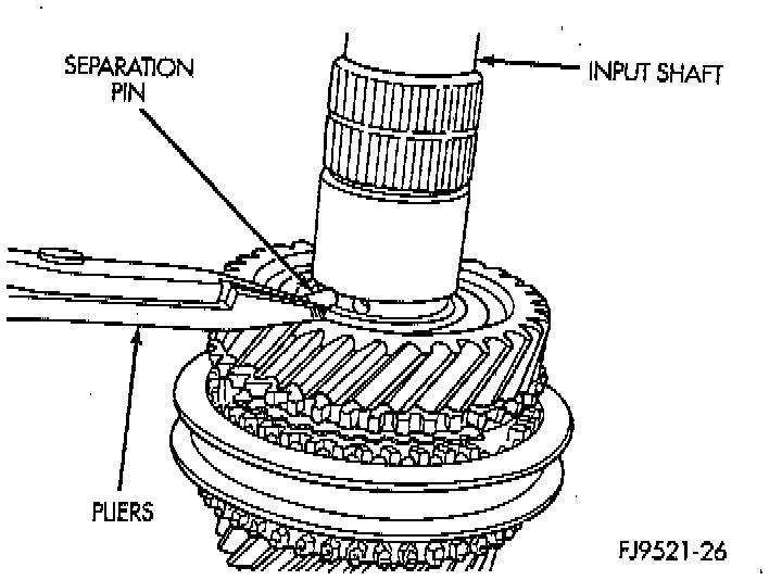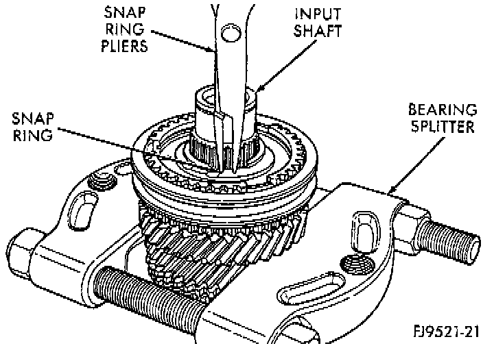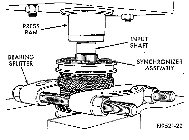 1. Install bearing splitter behind 5th speed gear. Remove snap ring at 5th synchronizer hub on input shaft.