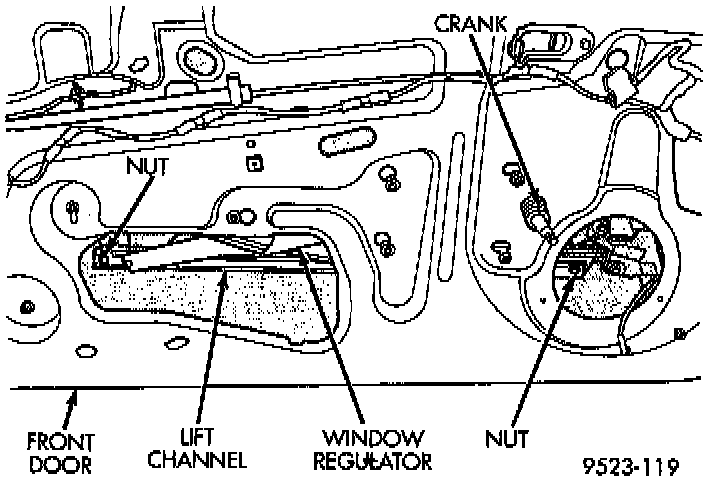 2. Move window regulator into position in door and engage bolt heads into key-hole slots in inner door panel and tighten bolts.