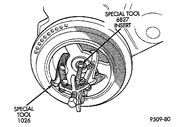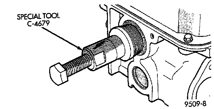 3. Remove crankshaft damper bolt. Remove damper using the large side of Special Tool 1026 and insert 6827.