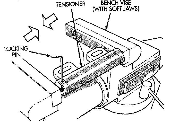 CAUTION: Index the tensioner in the vise the same way it is installed on the engine. This is to ensure proper pin orientation when tensioner is installed on the engine.