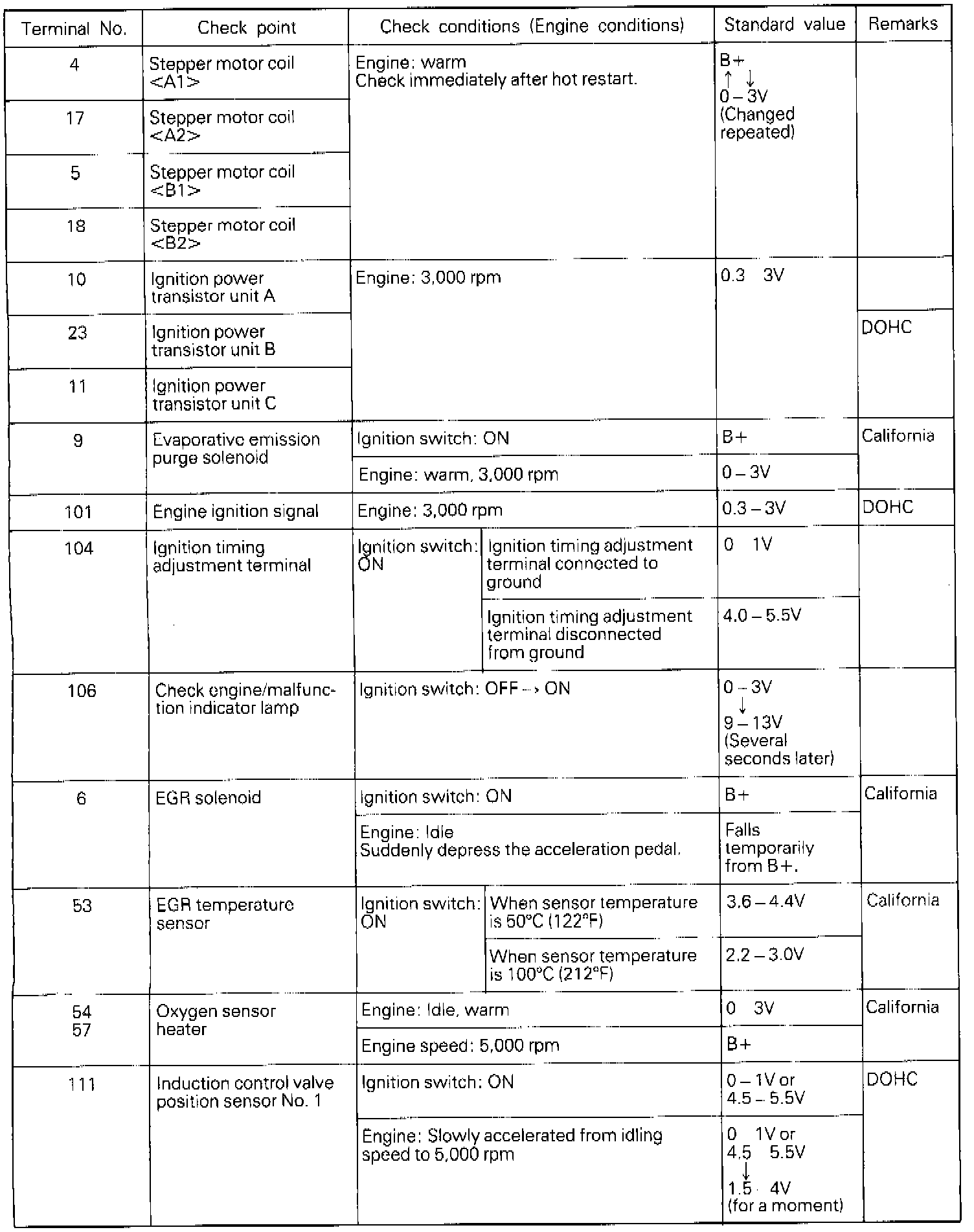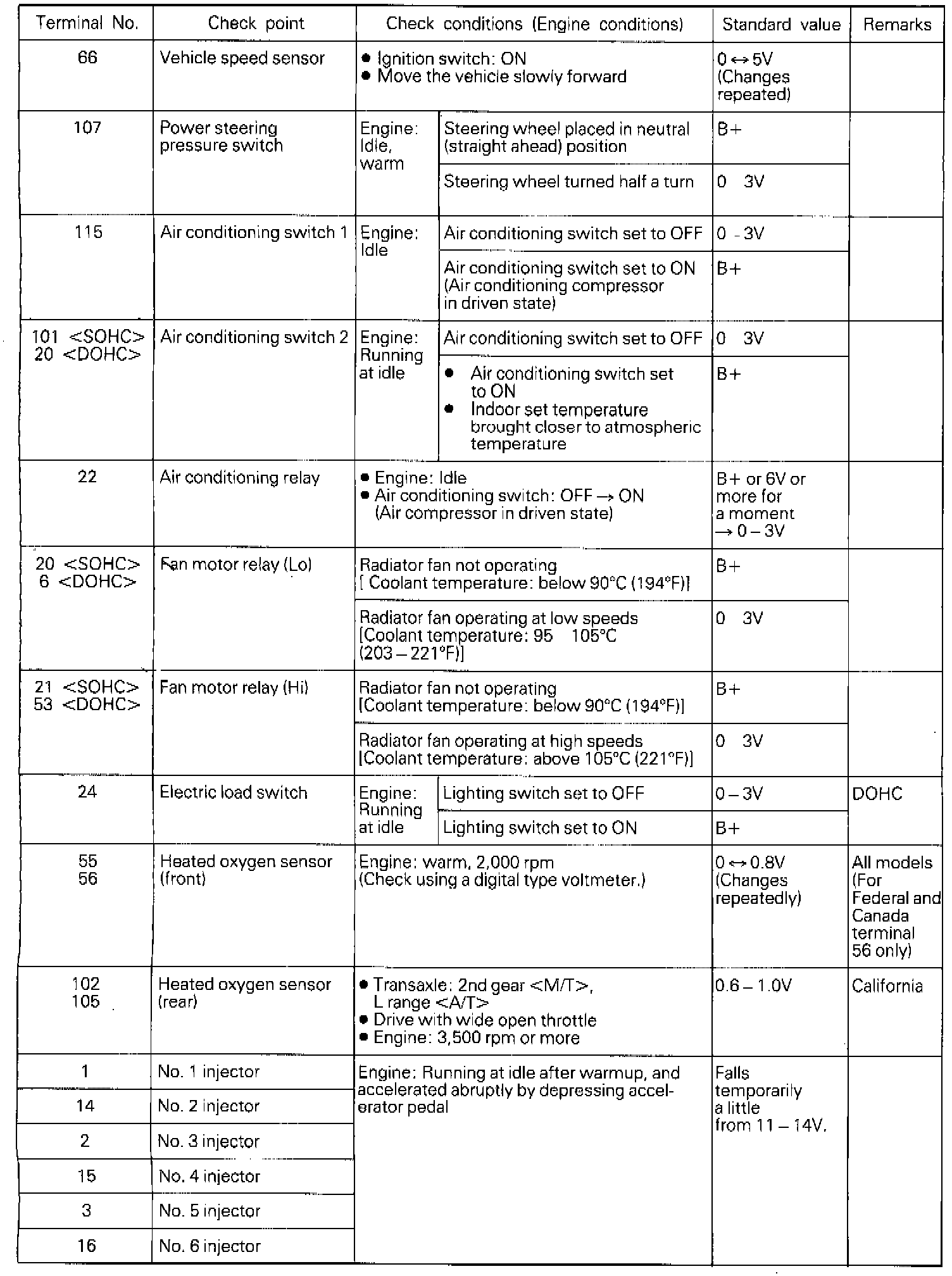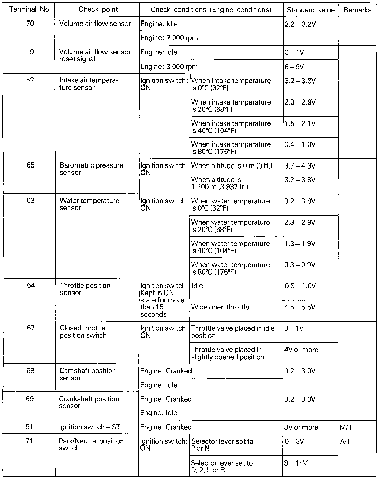2. Insert the very thin probe from the wire side into contact with each of the terminals of the Engine Control Module (ECM) connector and check the voltage, while referring to the check chart.