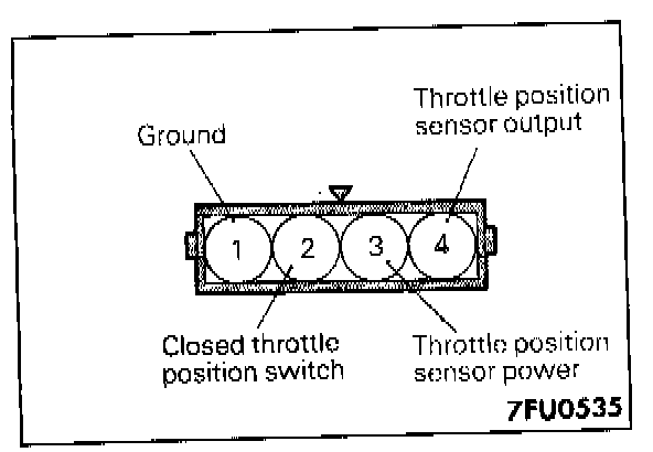 4. Check for continuity across terminals 2 (closed throttle position switch) and 1 (ground) with the throttle valve both fully closed and fully open.