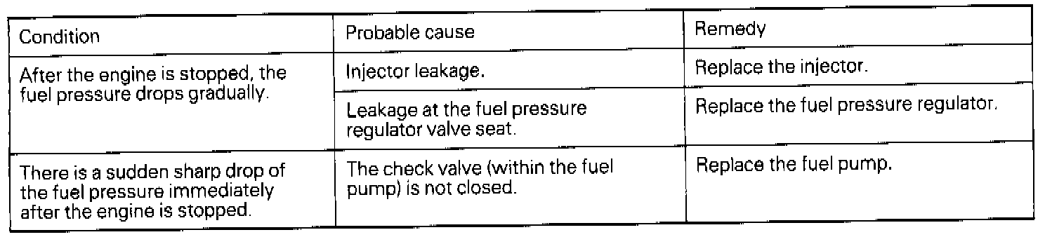 12. If the fuel pressure measured in steps 8 to 11 deviates from the standard value range, check for the probable cause by referring to the table above, and then make the appropriate repair.