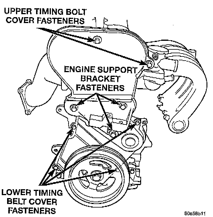 6. Lower vehicle and remove upper timing belt cover fasteners and remove cover.
