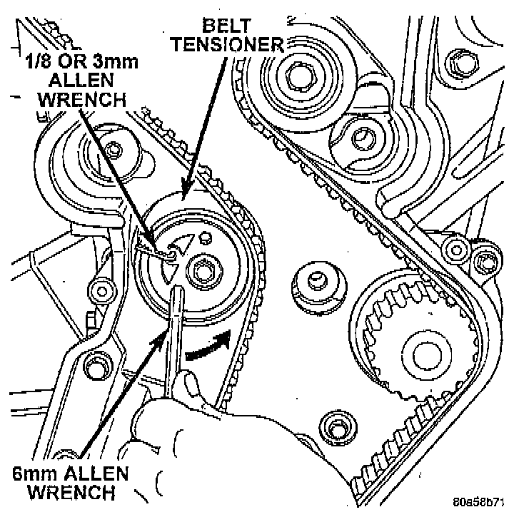 9. Install 6 mm Allen wrench into belt tensioner. Before rotating the tensioner insert the long end of a 1/8" or 3 mm Allen wrench into the pin hole on the front of the tensioner. While rotating the tensioner counterclockwise push in lightly on the 1/8" or 3 mm Allen wrench, until it slides into the locking hole.