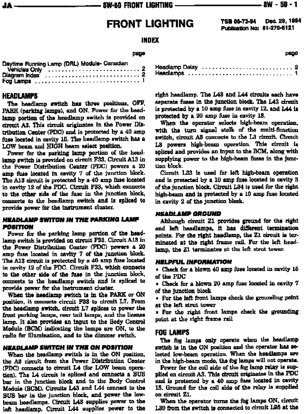 This Technical Service Bulletin contains revised Service Manual pages. The data link connector and fog lamp circuits have been revised.