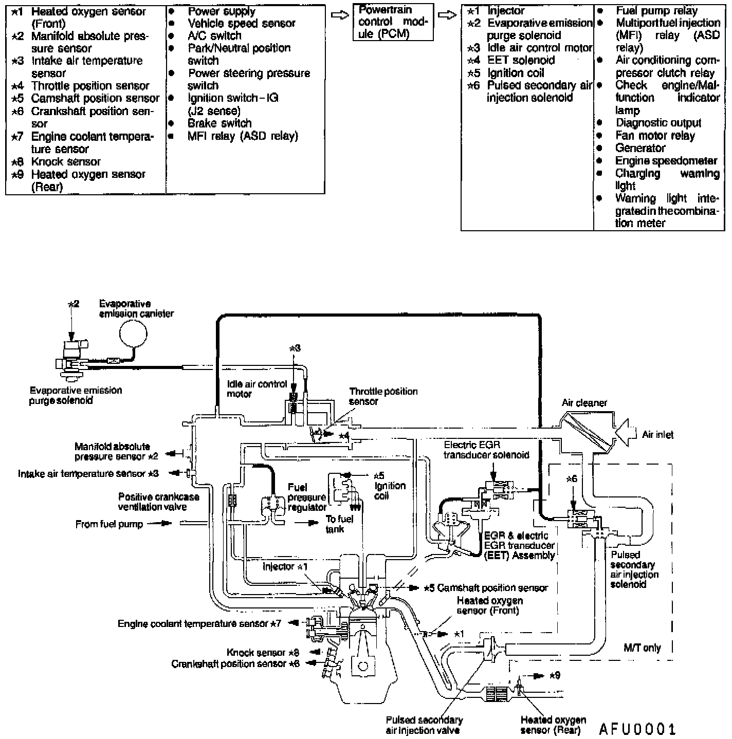 The Multiport Fuel Injection System consists of sensors which detect the engine conditions, the Powertrain Control Module (PCM) which controls the system based on signals from these sensors, and actuators which operate under the control of the PCM.