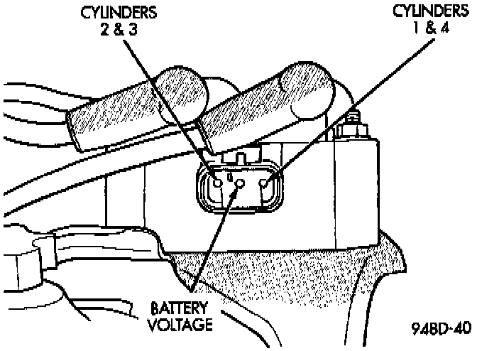 3. Measure the primary resistance of each coil. At the coil, connect an ohmmeter between the B+ pin and the pin corresponding to the cylinders in question Fig. 2. Resistance on the primary side of each coil should be 0.51 - 0.61 ohm. Replace the coil if resistance is not within tolerance.