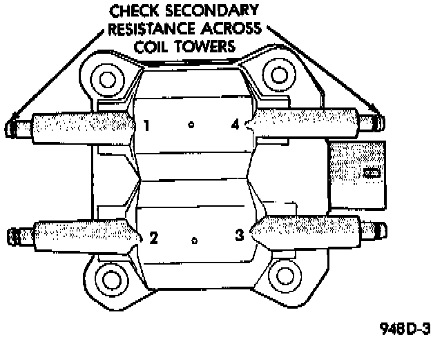4. Remove ignition cables from the secondary towers of the coil. Measure the secondary resistance of the coil between the towers of each individual coil Fig. 3. Secondary resistance should be 11,500 to 13,500 ohms. Replace the coil if resistance is not within tolerance.