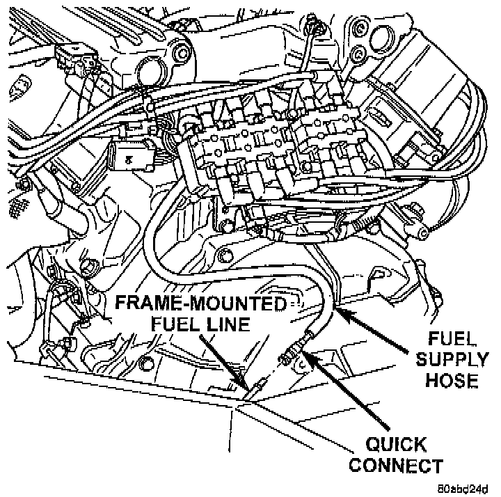 5. Lubricate the end of the chassis fuel tube with 30 WT oil. Connect fuel supply hose to chassis fuel tube assembly. pull back on the quick connect fitting to ensure complete insertion. Refer to Powertrain Management.