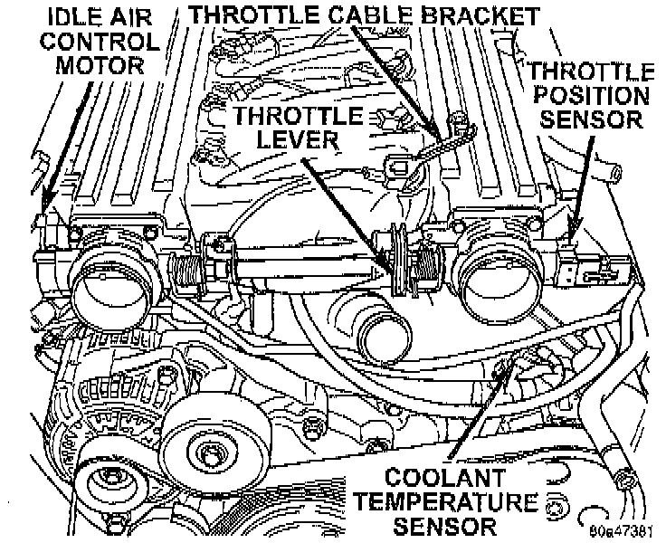 3. Remove intake air temperature sensor electrical connector from air cleaner. Remove throttle body hoses and air cleaner assembly.