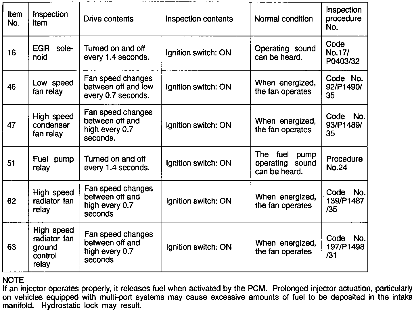 NOTE: If an injector operates properly, it releases fuel when activated by the PCM. Prolonged injector actuation, particularly on vehicles equipped with multi-port systems may cause excessive amounts of fuel to be deposited in the intake manifold. Hydrostatic lock may result.