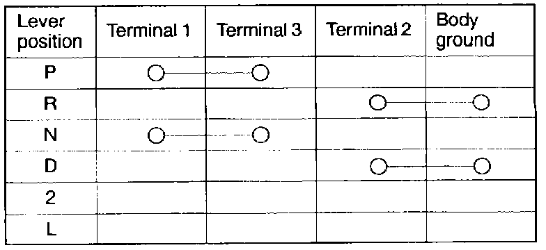 (2) Check the continuity between terminals 1-3 and 2-body ground while shifting the gearshift lever at each position. The continuity between terminals should be as shown in the table.