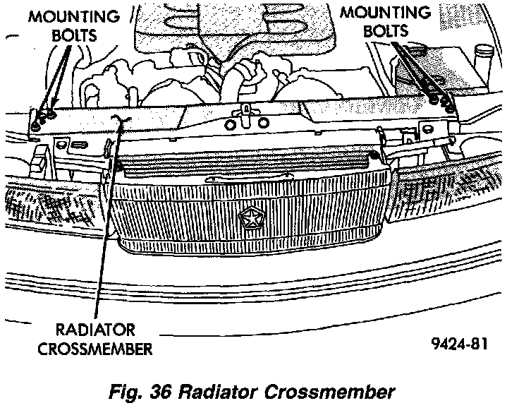 11. Remove upper radiator mounting screws to body. Access to mounting screws can be obtained through hole in headlamp module bracket.