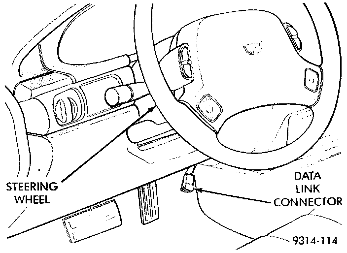 The data link connector ([1][2]diagnostic connector) links the DRB scan tool with the powertrain control module (PCM). The data link connector is located inside the vehicle, below instrument panel next to the center column (Fig. 29).