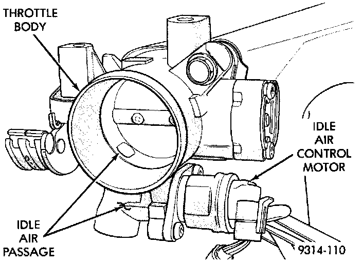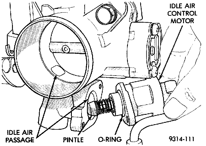 The throttle body has an air bypass passage that provides air for the engine at idle (the throttle blade is closed. The idle air control motor pintle protrudes into the air bypass passage and regulates air flow through it (Fig. 26).