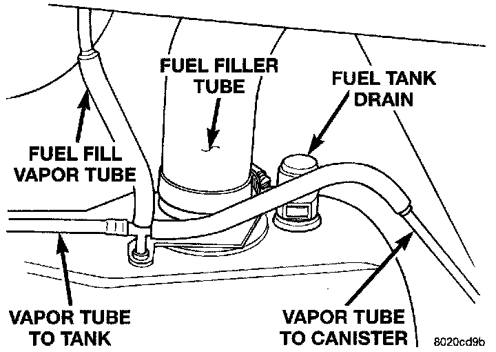 8. Disconnect fuel filler vapor relief tube from tee connecting it to the tank vapor relief tube and EVAP canister tube.