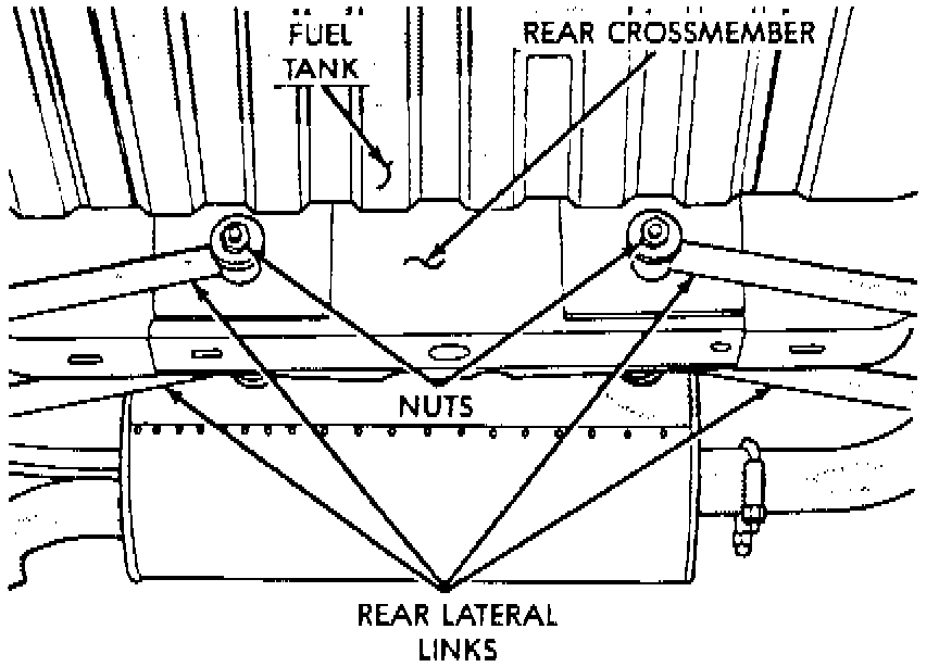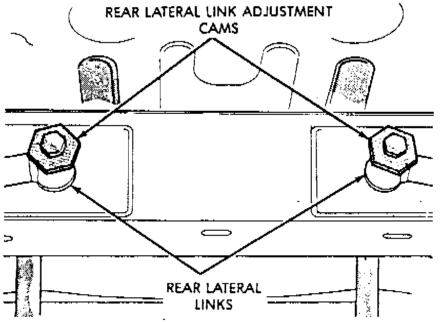 4. While holding toe adjustment cams from turning, tighten right and left lateral links to rear crossmember attaching bolt nuts. This will securely hold adjustment cams in position.