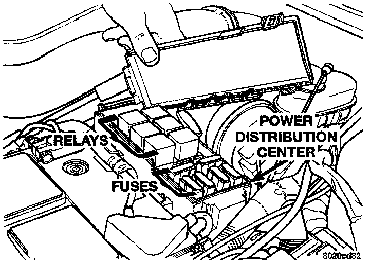 The power distribution center (PDC) is located next to the battery in the engine compartment. The PDC contains the starter relay, radiator fan relay, A/C compressor clutch relay, auto shutdown relay, fuel pump relay and several fuses. For the location of the relay within the PDC, refer to the PDC cover for location. Check electrical terminals for corrosion and repair as necessary.