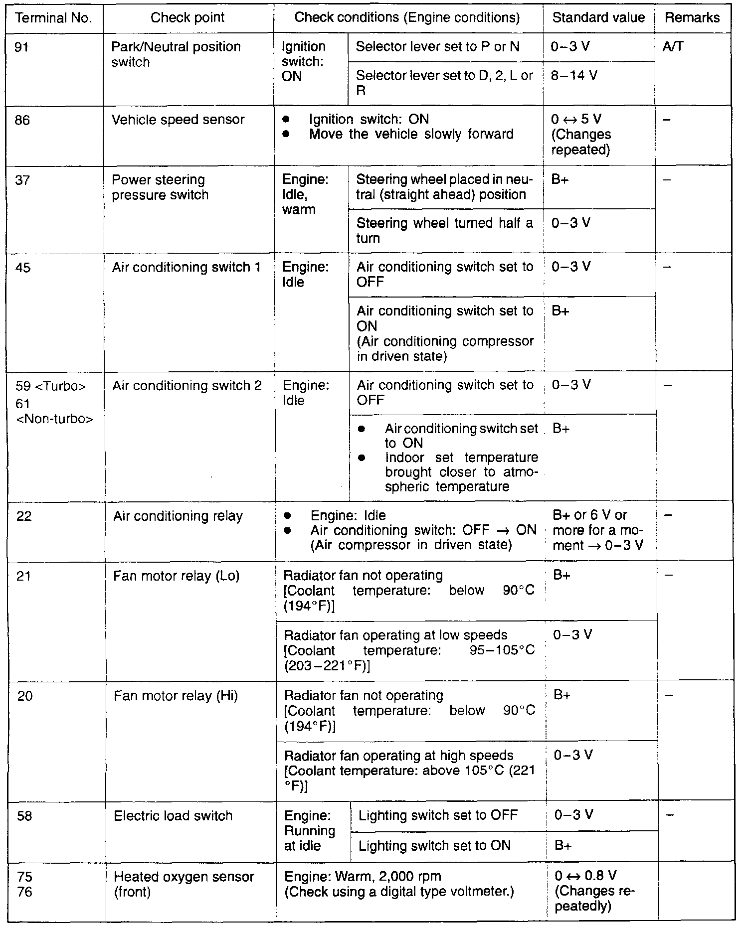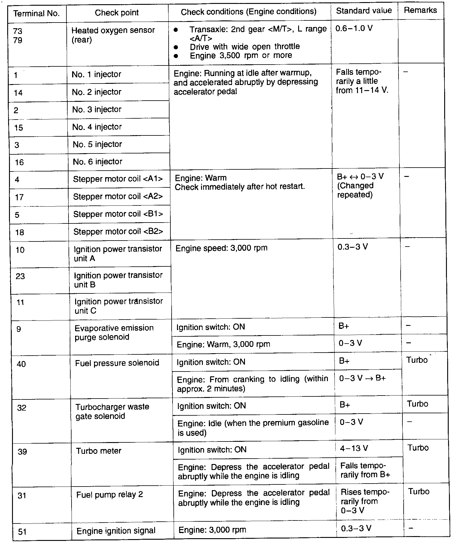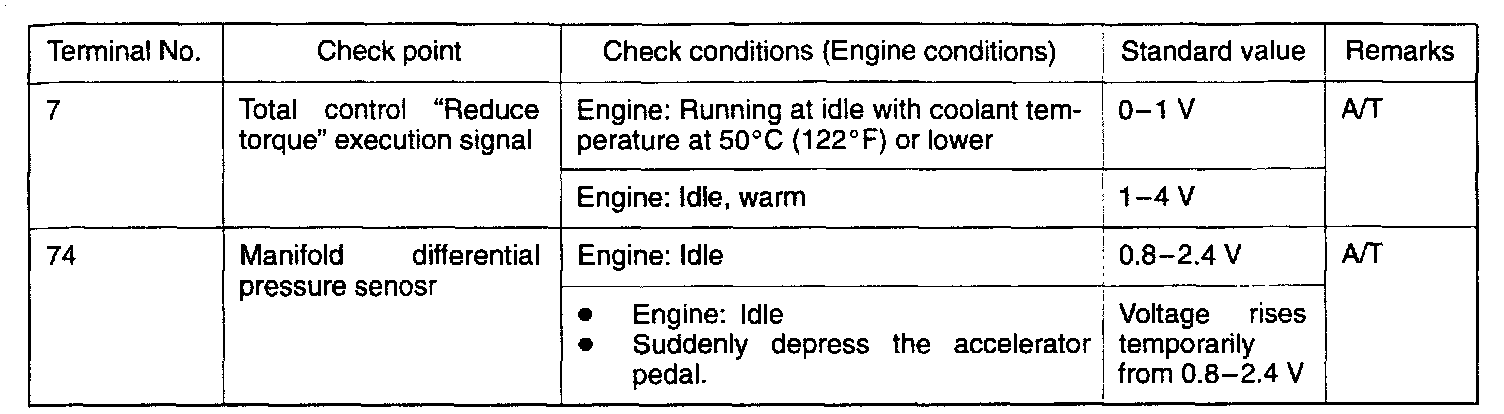 2. Insert the very thin probe from the wire side into contact with each of the terminals of the Engine Control Module (ECM) connector and check the voltage, while referring to the check chart.