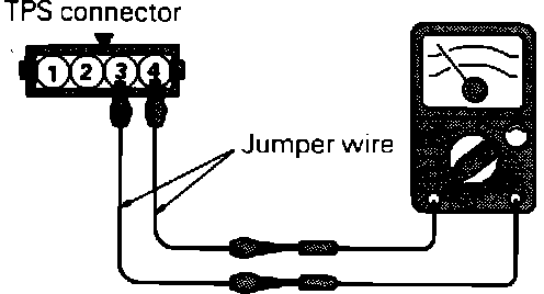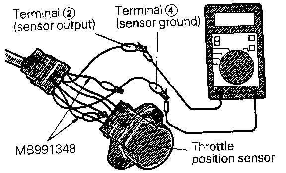 ^ Connect a digital voltmeter between the throttle position sensor terminal 2 (sensor output) and terminal 4 (sensor ground).