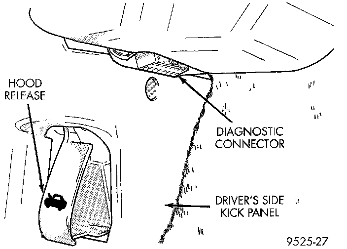 The data link connector [1][2]diagnostic connector links the DRB scan tool with the Powertrain Control Module (PCM). The data link connector is located inside the vehicle, under the instrument panel, at the driver's kick panel (Fig. 30).