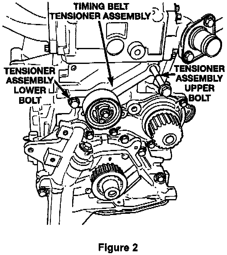 5. Remove the lower bolt attaching the timing belt tensioner assembly to the engine. Remove the tensioner and bracket assembly (Figure 2).