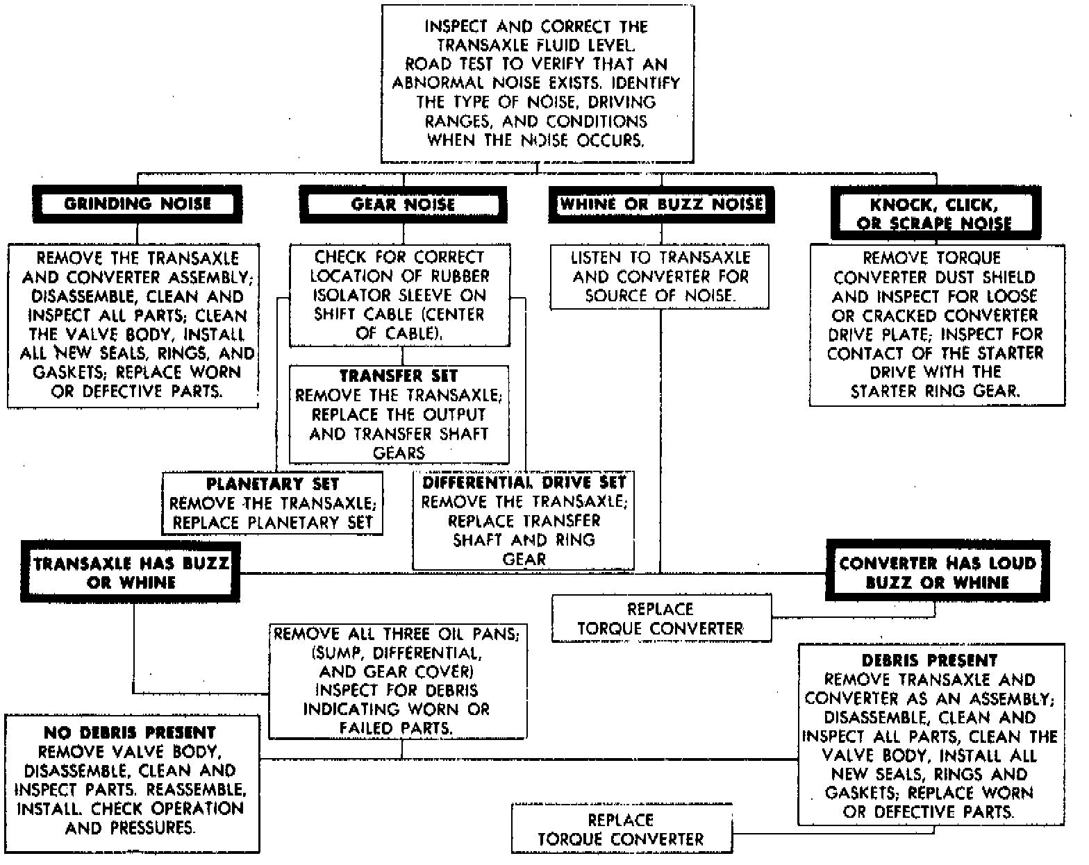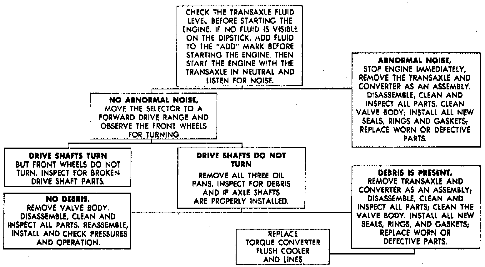 Before attempting any repair on the 41TE electronic automatic transaxle, general engine performance, transmission fluid level and shift linkage must first be checked and adjusted if necessary. For specific symptom diagnosis, refer to Figs.2 through 5 .