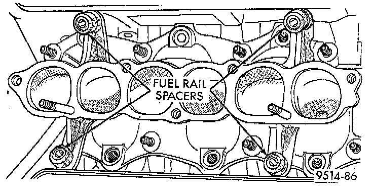 18. Lift fuel rail off engine. There are spacers under each fuel rail bolt.
